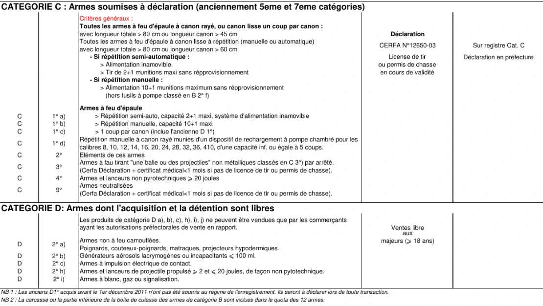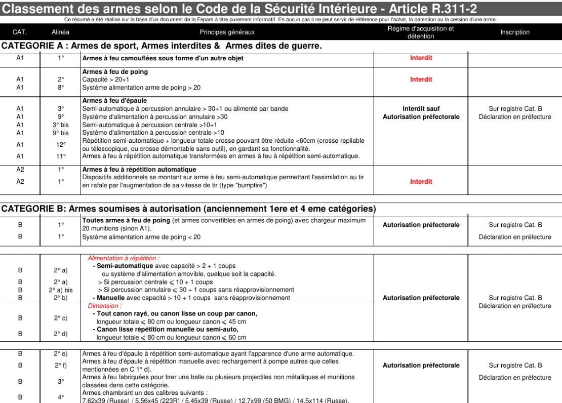 Classement des armes selon le Code de la Sécurité Intérieure